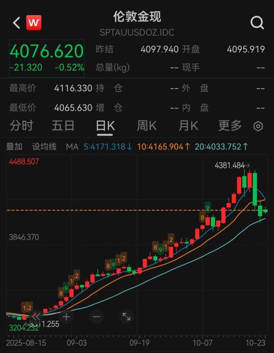 數(shù)據(jù)來源:Wind 10月22日,倫敦現(xiàn)貨黃金價格盤中逼近每盎司4000美元。23日亞洲早盤時段,倫敦現(xiàn)貨黃金為每盎司4090美元左右。 彭博社稱,技術指標顯示,本輪漲勢可能略顯過度,本周的回調令市場稍顯疲態(tài)。今年以來,金價已上漲約55%,近幾周,市場預期美聯(lián)儲將在年底前至少降息四分之一個百分點,同樣支撐了金價。 彭博援引分析師稱,金價仍守在4000美元上方,表明價格出現(xiàn)技術性回調,而非根本性轉變。 不少業(yè)內分析人士認為,資金獲利了結是近期金價滑落的重要原因。 長期投資者、對沖基金Crescat Capital的凱文·史密斯表示,本周的回調是一次健康的回調,并表示推動金價上漲的諸多因素仍然存在。 華爾街日報援引蘇克敦金融(Sucden Financial)研究團隊分析稱,投資者一直在對上周的投機性飆升進行部分平倉。貴金屬價格回落可能反映出投資者獲利了結及避險資金流的減少,而非美國國債收益率的走勢。仍然低迷的美國國債收益率和持續(xù)的宏觀不確定性將繼續(xù)為其價格提供潛在支撐。 (責任編輯:梁艷) |