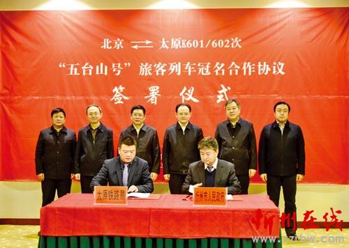 本報訊(記者 楊峰雷)12月27日,我市與太原鐵路局共同簽署冠名合作協(xié)議,北京至太原K601/K602次列車正式冠名為“五臺山號”。市委書記李俊明出席協(xié)議簽署儀式并致辭,市長鄭連生主持,市委常委、常務(wù)副市長趙志堅出席。太原鐵路局局長趙春雷專程來忻出席儀式。