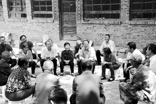 圖為市委常委、岢嵐縣委書記王志東,縣委副書記、縣長侯俊生在岢嵐縣趙家洼村與搬遷群眾座談,共話發(fā)展。