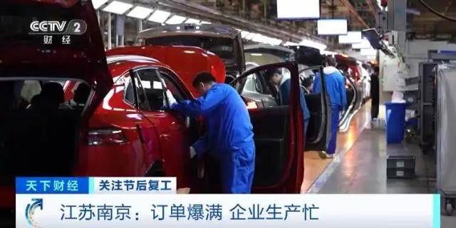 在南京市江北新區(qū)的一家大型汽車生產(chǎn)企業(yè),其中一個(gè)車間面積4萬平方米,產(chǎn)線從腳下延伸到了頭頂,工作人員正在緊張忙碌著,一輛輛嶄新的汽車高效地走向流水線。這里每天可以生產(chǎn)汽車1000輛左右。一些剛剛上市的新款新能源汽車產(chǎn)品,銷售非常火爆,訂單已經(jīng)排到了今年下半年。正月初五這里已經(jīng)全員在崗趕訂單。這個(gè)車間,每天兩個(gè)班組,1200多名工人日夜在崗,這個(gè)數(shù)字是去年春節(jié)同期的2.5倍。