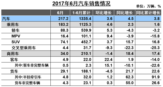分車型來看,6月轎車產(chǎn)銷量分別為89.6萬輛和88.3萬輛,同比分別下降1.0%和4.3%,環(huán)比則分別增長7.2%和5.3%,比上月有所好轉。上半年,轎車產(chǎn)銷分別為549.5萬輛和539.9萬輛,同比下降1.8%和3.2%。陳士華表示,轎車同比降幅較低,但基數(shù)較大,所以銷量下降相對較高。另外,轎車銷量下降與1.6升小排量購置稅政策退坡有關,此類車型占乘用車總銷量的三分之二左右。因此,協(xié)會希望購置稅政策能穩(wěn)定且固化,這將有利于汽車行業(yè)的總體發(fā)展。