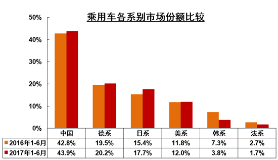 上半年,德系、日系、美系、韓系和法系乘用車分別銷售227.52萬輛、198.92萬輛、135.17萬輛、43.09萬輛和18.84萬輛,分別占乘用車銷售總量的20.22%、17.68%、12.01%、3.83%和1.67%。與上年同期相比,日系乘用車銷量保持較快增長,德系和美系增速略低,韓系和法系降幅依然明顯。陳士華表示,韓系車銷量下滑多少是受了政治因素的影響,然而最主要的原因還是產(chǎn)品競爭力低,新產(chǎn)品投放速度慢以及產(chǎn)品質量差等問題。