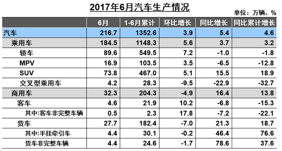 6月,我國汽車產(chǎn)銷分別為216.7萬輛和217.2萬輛,環(huán)比分別增長3.9%和3.6%,同比分別增長5.4%和4.5%。上半年,我國汽車產(chǎn)銷分別為1352.6萬輛和1335.4萬輛,比上年同期分別增長4.6%和3.8%,低于上年同期1.9和4.3個百分點。