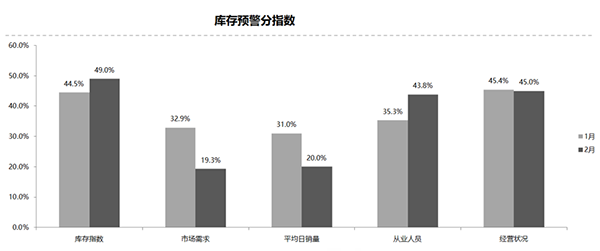 從庫(kù)存預(yù)警分指數(shù)來(lái)看,庫(kù)存指數(shù)、從業(yè)人員指數(shù)環(huán)比上升;市場(chǎng)銷(xiāo)量指數(shù)、平均日銷(xiāo)量指數(shù)、經(jīng)營(yíng)狀況指數(shù)環(huán)比下降。樊宇表示,2月庫(kù)存預(yù)警指數(shù)較高,依然位于50%的警戒線之上。同時(shí),因?yàn)槭袌?chǎng)需求和平均日銷(xiāo)量呈明顯下降狀態(tài),經(jīng)銷(xiāo)商面臨較大壓力。