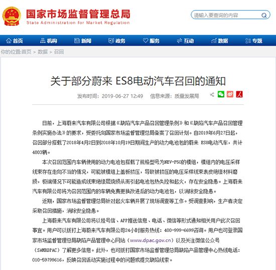 日前,上海蔚來汽車有限公司向國家市場監(jiān)督管理總局備案了召回計劃。自2019年6月27日起,召回部分搭載了2018年4月2日到2018年10月19日期間生產(chǎn)的動力電池包的蔚來