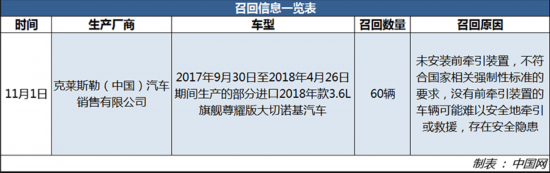 中國網(wǎng)汽車11月4日訊 近日,克萊斯勒(中國)汽車銷售有限公司根據(jù)《缺陷汽車產(chǎn)品召回管理條例》和《缺陷汽車產(chǎn)品召回管理條例實施辦法》的要求,向國家市場監(jiān)督管理總局備案了召回計劃。決定自11月1日起,召回2017年9月30日至2018年4月26日期間生產(chǎn)的部分進口2018年款3.6L旗艦尊耀版大切諾基汽車,共計60輛。