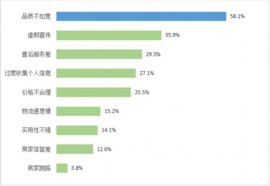 56.5%的受訪者表示對當前的消費環(huán)境比較放心或非常放心。58.1%的受訪者對當前商品/服務不滿意的首要原因是“品質(zhì)不如意”,“虛假宣傳”也是受訪者反映較為集中的不滿意原因,占比超過35.9%?!笆酆蠓詹睢?29.3%)、“過度收集個人信息”(27.1%)等方面也是造成受訪者對現(xiàn)有消費商品和服務不滿意的重要原因。