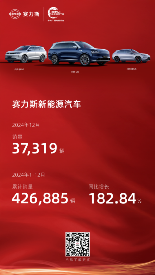 2025年1月1日,賽力斯發(fā)布2024年12月產銷快報。數據顯示,賽力斯12月新能源汽車銷量達37319輛;1-12月新能源汽車累計銷量達426885輛,同比增長182.84%。