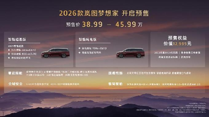 8月29日,第二十八屆成都國際汽車展覽會盛大開幕。全面煥新升級的“新時代旗艦MPV”2026款嵐圖夢想家預(yù)售亮相。本次新車共推出智能超混版和智能純電版兩個動力版本,預(yù)售價為38.99萬-45.99萬,同步推出了價值超萬元的多項(xiàng)重磅權(quán)益,包括2000元抵5000元尾款的膨脹金,終身免費(fèi)三電質(zhì)保、終身免費(fèi)基礎(chǔ)保養(yǎng)和優(yōu)先交付提車。9月1日起,2026款嵐圖夢想家展車、試駕車將陸續(xù)到店,消費(fèi)者可以進(jìn)店親自體驗(yàn)新車的獨(dú)特魅力。