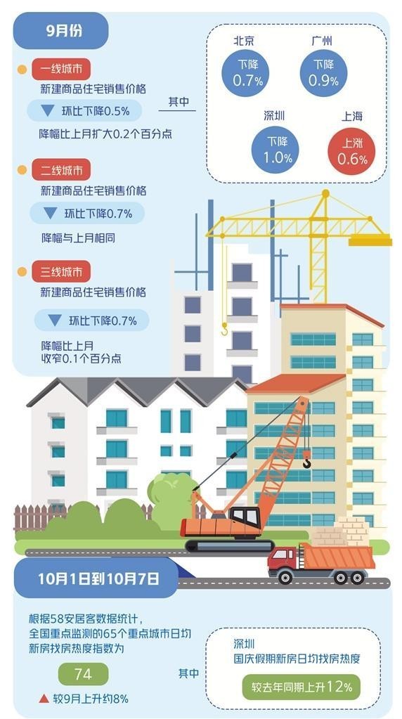 9月26日,中央政治局會議定調(diào)“要促進房地產(chǎn)市場止跌回穩(wěn)”,釋放出“穩(wěn)地產(chǎn)”信號。隨后,一線城市集中優(yōu)化樓市政策,廣州全面取消限購,北京、上海、深圳優(yōu)化限購、限貸政策,北京、上海明確將及時取消普宅認(rèn)定標(biāo)準(zhǔn),深圳取消限售,上海、深圳增值稅免征年限“5改2”,帶動國慶假期樓市熱度顯著提升。