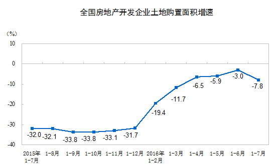 1-7月份,房地產(chǎn)開發(fā)企業(yè)土地購置面積11167萬平方米,同比下降7.8%,降幅比1-6月份擴(kuò)大4.8個百分點;土地成交價款3848億元,增長7.1%,增速回落3.1個百分點。