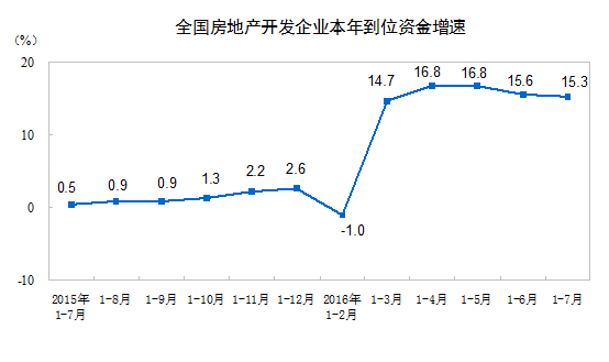 1-7月份,房地產(chǎn)開發(fā)企業(yè)到位資金79881億元,同比增長15.3%,增速比1-6月份回落0.3個百分點。其中,國內(nèi)貸款12605億元,增長0.7%;利用外資93億元,下降49.8%;自籌資金27877億元,增長0.4%;其他資金39307億元,增長36.3%。在其他資金中,定金及預(yù)收款22321億元,增長31.6%;個人按揭貸款13305億元,增長54.6%。
