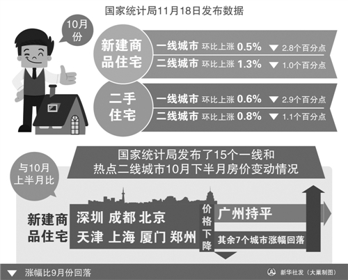 國家統(tǒng)計(jì)局城市司高級(jí)統(tǒng)計(jì)師劉建偉介紹,與10月份上半月比,10月份下半月新建商品住宅價(jià)格除深圳和成都2個(gè)城市繼續(xù)下降外,北京、天津、上海、廈門和鄭州等5個(gè)城市也由升轉(zhuǎn)降,降幅在0.1至0.4個(gè)百分點(diǎn)之間;其余7個(gè)城市新建商品住宅價(jià)格環(huán)比漲幅進(jìn)一步回落,回落幅度在0.4至3.3個(gè)百分點(diǎn)之間。