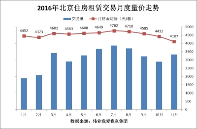 按照慣例,10月之后北京租賃市場進(jìn)入傳統(tǒng)淡季,剛剛過去的11月,北京月租金均價創(chuàng)年內(nèi)新低。據(jù)偉業(yè)我愛我家集團市場研究院統(tǒng)計,2016年11月,北京區(qū)域通過我愛我家達(dá)成的住宅租賃交易量環(huán)比10月同期上漲14.8%,但月租金均價為4107元/平米,環(huán)比10月下跌6.9%。