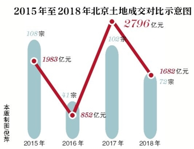 但是,進(jìn)入2018年,北京土地市場出現(xiàn)了較為明顯的降溫。2018年,北京共成交土地72宗,成交額1682.9億元。成交宗數(shù)及成交額同比均大幅下跌。2018年土地成交宗數(shù)同比2017年下跌29%,僅高于2016年成交水平,處于歷史低位,土地出讓金同比2017年下跌40%。