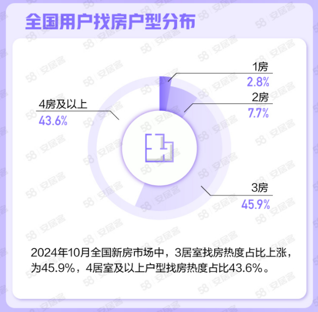 在用戶找房戶型方面,3居室仍為現(xiàn)階段熱度較高的戶型,找房熱度占比上漲,為45.9%,4居室及以上戶型找房熱度占比43.6%。張波分析稱,改善潛在需求入場(chǎng)的趨勢(shì)表現(xiàn)明顯,10月全國購房群體中三、四房的需求占比持續(xù)提升,二手房交易稅費(fèi)的減免加之利率下行,是推動(dòng)改善需求積極入市的組合性政策效果表現(xiàn)。