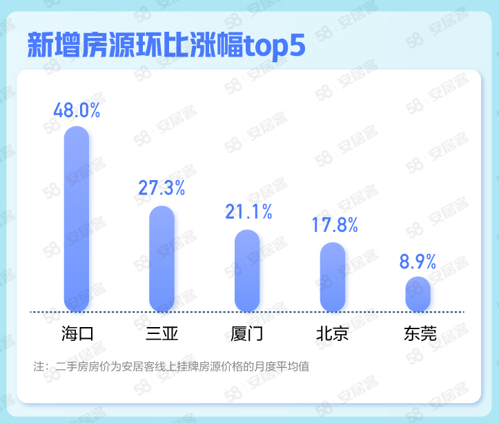 在新增供應(yīng)方面,10月全國65城新增掛牌房源量環(huán)比下跌4.1%。全國新增掛牌量房源環(huán)比上漲的前三名城市分別是海口、三亞、廈門,分別上漲48%、27.3%、21.1%。