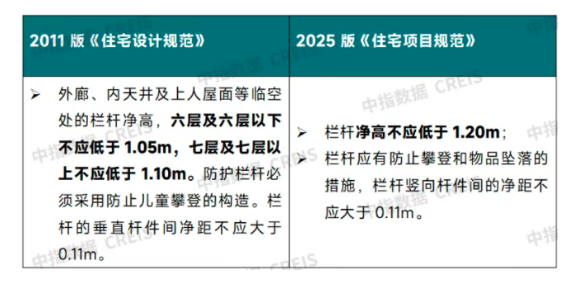 2011版《住宅設計規(guī)范》按住宅層數對陽臺欄桿高度提出了不同要求,2022版《住宅項目規(guī)范》(征求意見稿)將陽臺欄桿高度統(tǒng)一調整為1.1米,2025版新規(guī)再次將這一標準提高至1.2米。