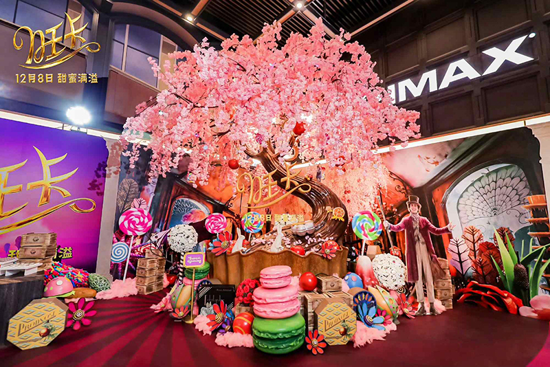 首映現(xiàn)場,最引人注目的當(dāng)屬電影里標(biāo)志性的巧克力櫻花樹。片中,旺卡在粉色櫻花樹下漫灑巧克力糖果,夢幻爛漫,猶如童話仙境。而在首映禮現(xiàn)場,這棵櫻花樹也被完美復(fù)刻,櫻花樹四周堆滿各色巧克力糖果和花朵,令觀眾可以親身走入巧克力“花海”,成為當(dāng)天的打卡點。