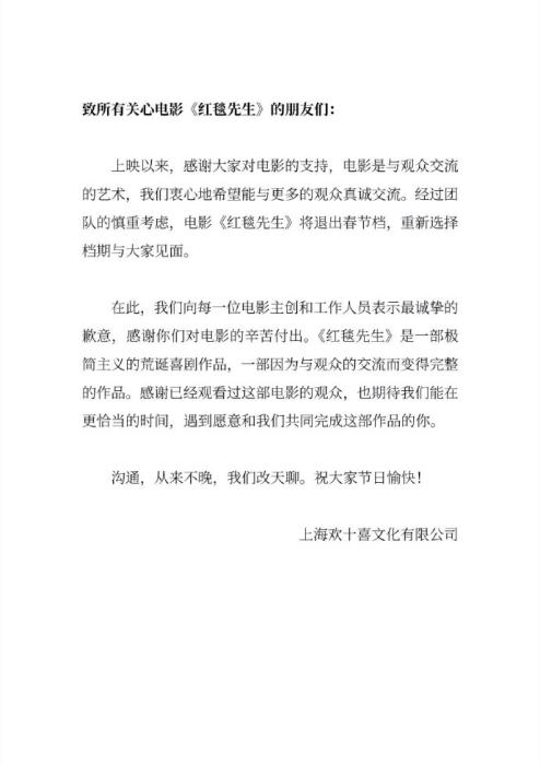 果然,上映6天后,《紅毯先生》宣布撤檔,表示“期待能在更恰當(dāng)?shù)臅r間,遇到愿意和我們共同完成這部作品的你”。事實上,這已是該片第二次更換檔期,原本定的上映日期是2023年11月17日。