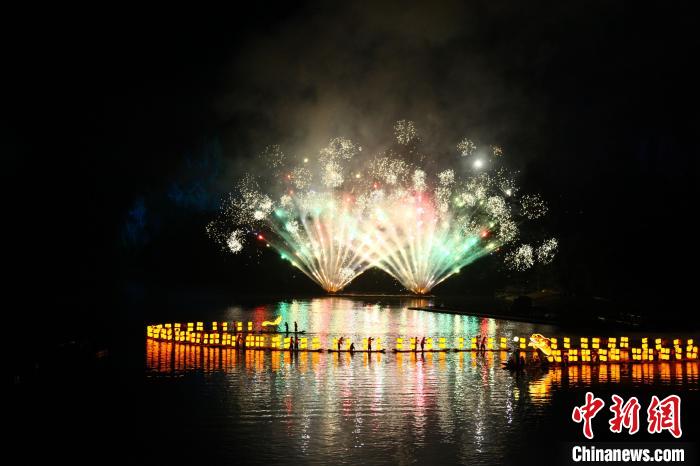 慶典演出現(xiàn)場人頭攢動,開場無人機(jī)表演在半空組合出紀(jì)念“印象劉三姐20年”的圖案,舞臺上擊鼓而舞的表演者渲染歡樂氛圍。以絢爛煙火為背景,漁翁表演者在江面組成蜿蜒長龍,引得游客們紛紛贊嘆拍照。慶典演出環(huán)節(jié),桂林旅游學(xué)院和《印象·劉三姐》的演員們共同表演的舞蹈《漓江·春茶》、百人合唱《侗族大歌》、實(shí)景展演《龍騰印象》等精彩節(jié)目,帶來一場視覺盛宴。