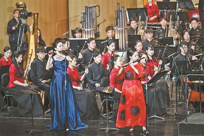 展現(xiàn)“潮”與“年輕態(tài)”的當(dāng)代民樂作品——雙竹笛協(xié)奏曲《熱情與冷漠的邂逅》融入了南音元素。(廈門日報記者 林銘鴻 攝)