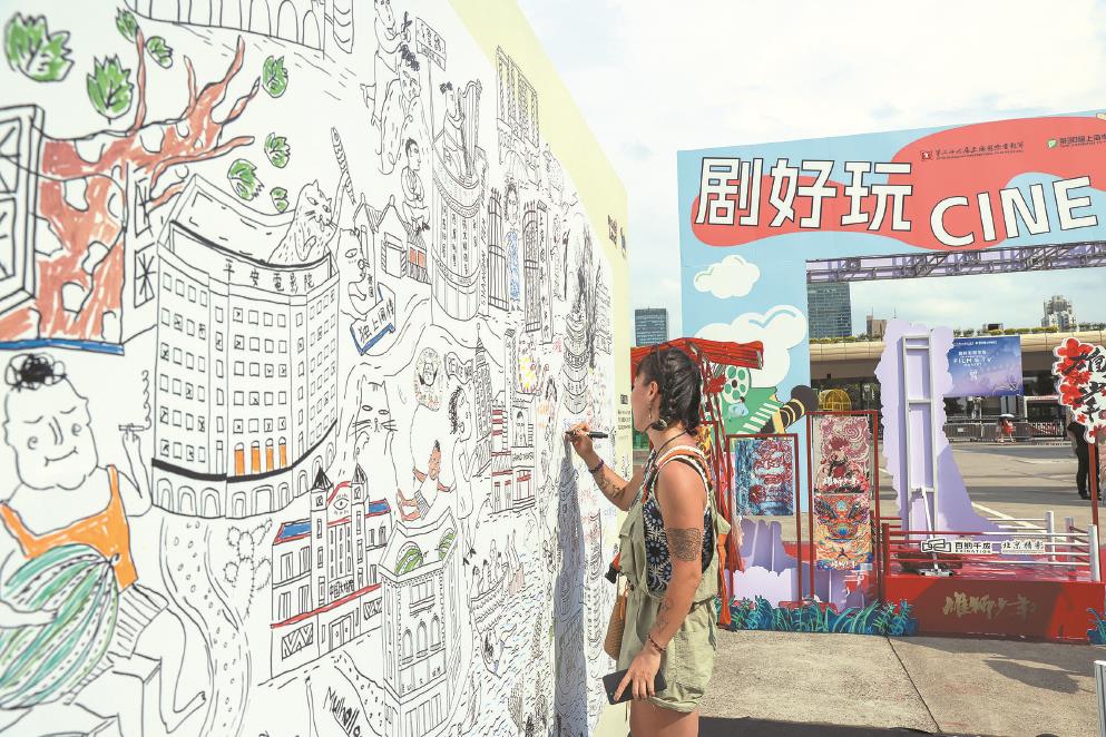 胡子拉碴的警員阿Sir、動(dòng)畫(huà)電影《馴龍高手》中的無(wú)牙仔、充滿(mǎn)懸念的“醬園弄現(xiàn)場(chǎng)”……在上海展覽中心,立有一塊由插畫(huà)師Rosá玫瑰與市民共創(chuàng)的“我的電影故事”畫(huà)板,一筆筆手繪中埋下很多城市彩蛋與弄堂故事,更有影迷在空白插畫(huà)區(qū)記錄下自己的“私影史”。畫(huà)板右上角有一處方方正正的電影院簡(jiǎn)筆畫(huà),連進(jìn)場(chǎng)路線(xiàn)都用火柴人標(biāo)注清楚,Movieland小程序工作人員韓語(yǔ)指著這處手繪告訴記者:“一位影迷過(guò)來(lái),說(shuō)‘怎么能沒(méi)有我們滬北電影院呢?我也要畫(huà)一個(gè)’,他就趴在畫(huà)板畫(huà)了快半小時(shí),昨天太陽(yáng)那么大,背都曬紅了?!?/p>