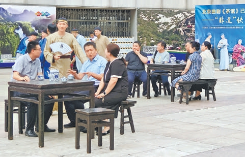 “喲,這位爺,您里邊請(qǐng)!”昨天下午,北京北站下沉廣場(chǎng)上,一位位身著戲服的曲劇演員登場(chǎng),邀請(qǐng)過(guò)往行人移步至一旁的“茶館”品茶。旅客被演員帶入沉浸式表演中,現(xiàn)場(chǎng)不時(shí)發(fā)出笑聲和喝彩聲。原來(lái)這是北京市重點(diǎn)站區(qū)管理委員會(huì)北站辦與北京市曲劇團(tuán)聯(lián)合策劃的“黨建引領(lǐng)·京韻暢行”快閃活動(dòng)。此次快閃活動(dòng)通過(guò)沉浸式表演,將北京曲劇《茶館》片段融入旅客和市民的出行場(chǎng)景。