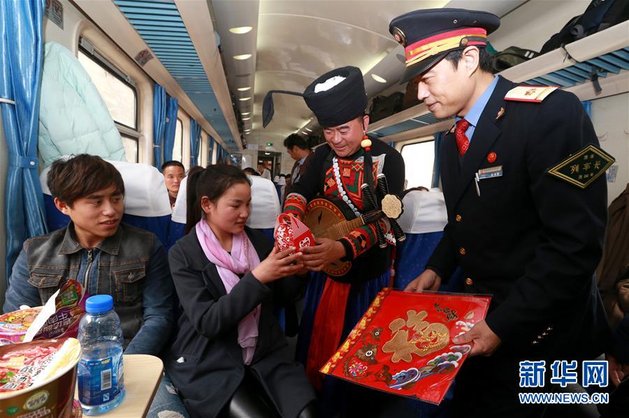 2月1日,彝族藝術(shù)家在K165次列車上為旅客表演。當(dāng)日,在西安鐵路局西安至昆明的K165次列車上,四川美姑縣原生態(tài)畢摩樂隊與西安客運段職工民樂小分隊聯(lián)合舉辦“英雄列車民族之聲親情溫暖回家路”音樂會,畢摩樂隊用口弦、哈門、木葉、瑪布等彝族民間樂器演奏的音樂為返鄉(xiāng)過年的旅客提前送上新年祝福。民間藝術(shù)家和列車乘務(wù)員還為旅客們送上“?!弊?、春聯(lián)。新華社發(fā)