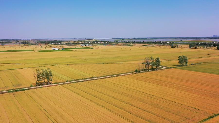 初夏時節(jié),安徽省潁上縣廣袤大地上麥香四溢。麥田在陽光下泛著金黃,麥浪滾滾,收獲在望。麥田、村落、河流、阡陌構成一幅美麗的田園風光。(徐紅梅)??