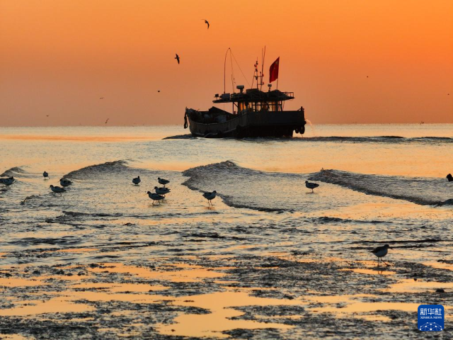 11月19日,海鳥在江蘇省連云港市贛榆區(qū)沿海濕地里覓食(無人機(jī)照片)。新華社發(fā)(司偉攝)