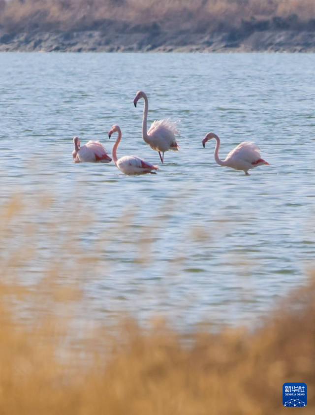 11月19日,火烈鳥在山西運(yùn)城鹽湖棲息。新華社發(fā)(閆鑫攝)