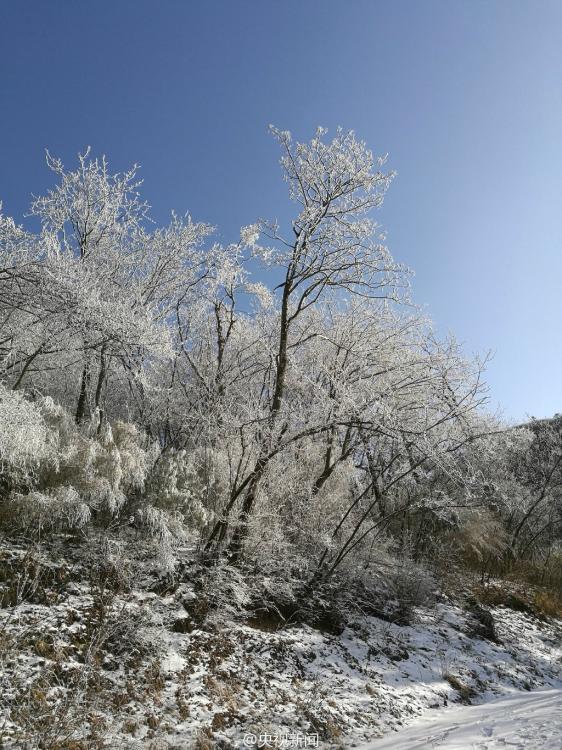 受較強(qiáng)冷空氣影響,秦嶺腹地涼風(fēng)埡山頂,出現(xiàn)大面積霧凇景觀。玉樹(shù)瓊枝,晶瑩剔透,讓涼風(fēng)埡山頂變得像童話(huà)世界一般,美不勝收。 央視記者王志杰 圖片來(lái)源:央視新聞微博
