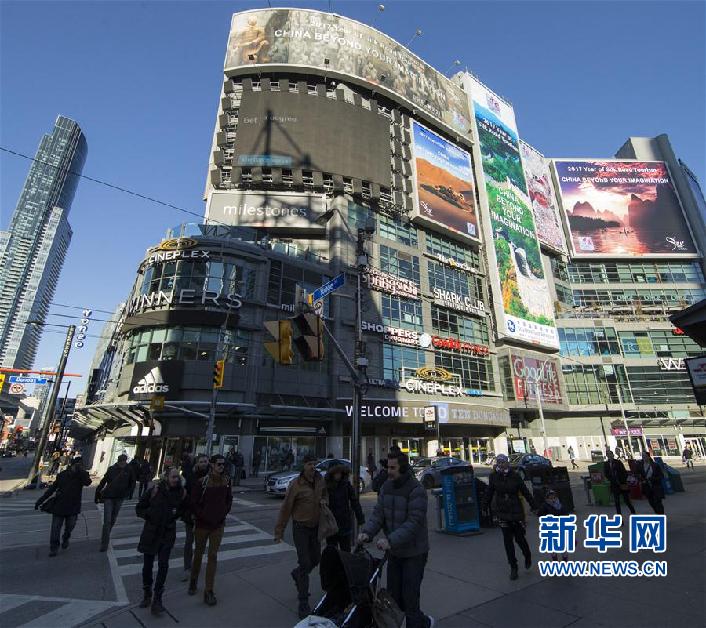 這是1月1日在加拿大多倫多市中心的鄧達(dá)斯廣場拍攝的“美麗中國——2017絲綢之路旅游年”主題宣傳廣告牌。從2016年12月26日起,由中國國家旅游局推出、以“美麗中國——2017絲綢之路旅游年”為主題的大型旅游宣傳廣告在加拿大多倫多市中心鄧達(dá)斯廣場亮相,向人們展示中國美麗而豐富的旅游資源。整個(gè)活動(dòng)將持續(xù)5周。新華社發(fā)(鄒崢攝)