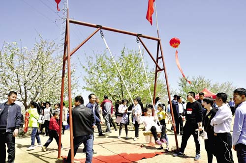 4月23日,為了進(jìn)一步鞏固脫貧成效,提升鄉(xiāng)村旅游品牌效應(yīng),展示當(dāng)?shù)靥厣r(nóng)產(chǎn)品和黃土高原的風(fēng)土人情,保德縣楊家灣鎮(zhèn)段家溝村隆重舉辦了首屆美麗鄉(xiāng)村賞花攝影節(jié)。圖為前來賞花的游客正在蕩秋千。(劉澤宇 攝)