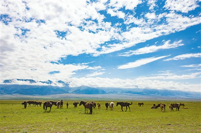 七月的新疆維吾爾自治區(qū)哈密市天山景區(qū),藍(lán)天、白云和綠色田野共同構(gòu)成一幅美景,置身其中,仿佛走進(jìn)奇美的畫(huà)卷,讓人感到無(wú)限愜意。