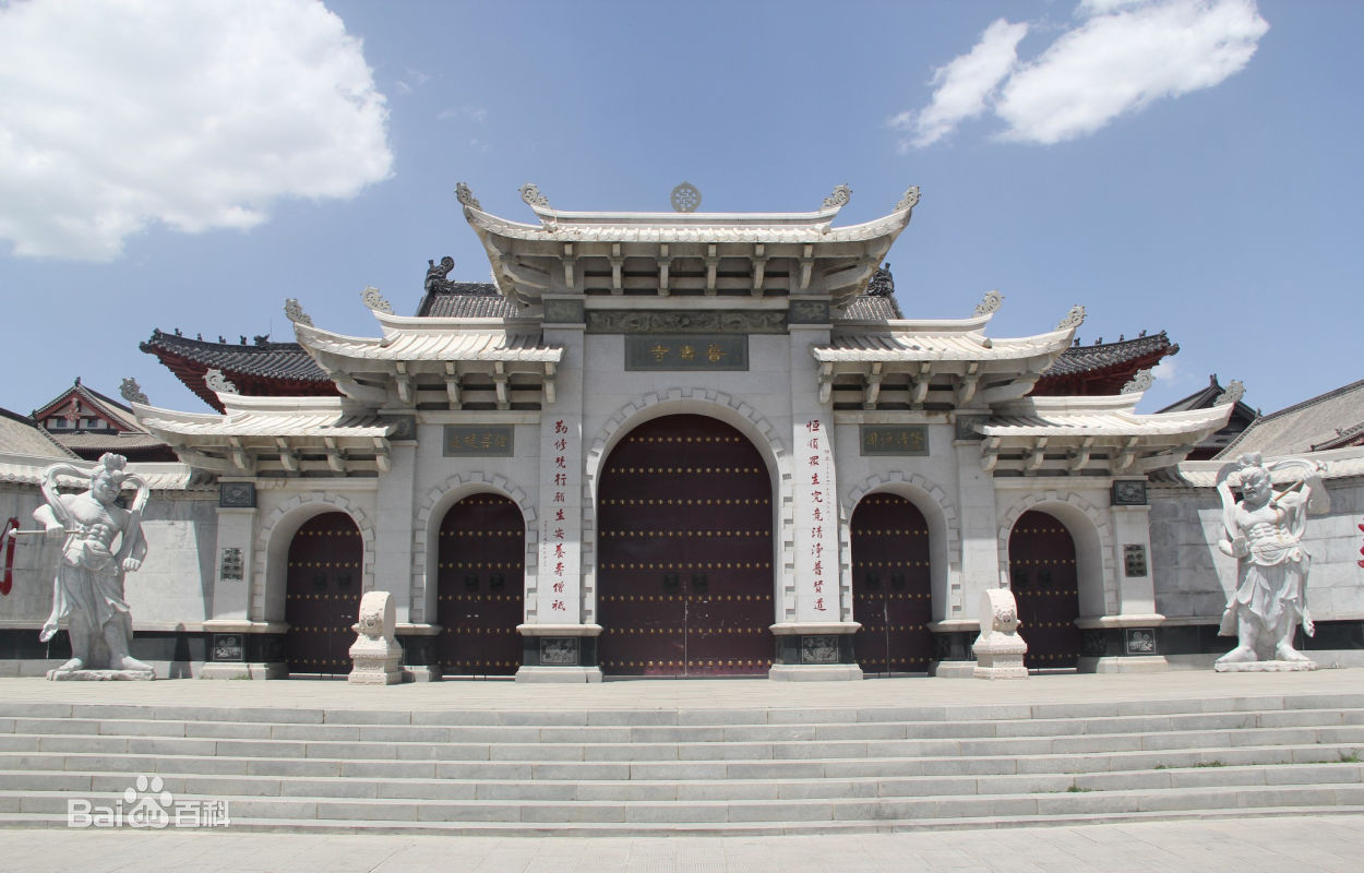新建的普壽寺坐北面南,占地面積一萬九千九百八十八平方米。寺內(nèi)分為東西兩院,東院偌大,前面為非常秀麗的漢白玉牌樓,下層為青磚砌筑,上層為木構(gòu)建筑,單檐五脊頂,四出廊。山門正面額上嵌一書有「普壽寺」三字的石匾。西院一進(jìn)四個小四合院,第一為天王殿院,正面為天王殿,三開間,單檐歇山頂。殿內(nèi)正中置木龕,供石刻彌勒佛,背面供彩塑韋馱將軍,兩山間彩塑四大天王。天王殿兩側(cè)為鐘鼓二樓。東西樓二十四間,東配樓為客堂,墻上掛著名人字畫,其中有原中國佛教協(xié)會會長趙樸初書寫的一副對聯(lián)「恒順眾生究竟清涼普賢道,勤修梵行愿生安養(yǎng)壽僧祗」。