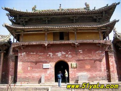 山門(mén)最古,為金時(shí)原構(gòu),五開(kāi)間,兩層,下層磚砌高臺(tái),中柱上裝青石門(mén)框及板門(mén),門(mén)框上線刻花紋,圖案秀美。上層施平座及勾欄,粱架現(xiàn)整簡(jiǎn)潔,結(jié)構(gòu)已具元代爬梁的雛形。屋頂琉璃為明代補(bǔ)制,鮮麗勁秀。這種高臺(tái)以上的門(mén)廡或殿宇,見(jiàn)宇敦煌壁畫(huà),實(shí)物中少有。