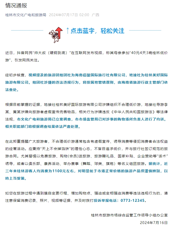 中新網(wǎng)7月17日電 桂林市文化廣電和旅游局官微發(fā)布情況通報(bào),近日,抖音網(wǎng)民“帥大叔(硬鋼到底)”在互聯(lián)網(wǎng)發(fā)布視頻,稱其母親參加“40元4天3晚桂林低價游”,引發(fā)網(wǎng)民關(guān)注。