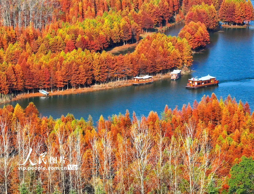 初冬時節(jié),江蘇省淮安市盱眙縣天泉湖色彩斑斕,落羽杉林枝葉飄紅,與碧水相映成趣,構成一幅美麗的冬日生態(tài)畫卷。方東旭攝(人民圖片網)