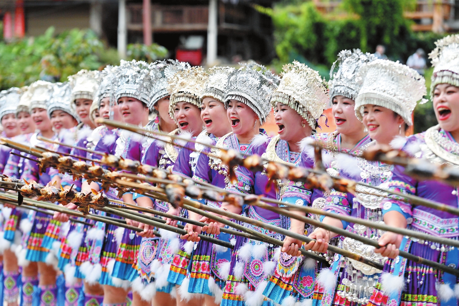 近年來,廣西柳州市融水苗族自治縣充分利用當(dāng)?shù)刭Y源,推動漁旅融合發(fā)展,助力鄉(xiāng)村振興。圖為10月18日,村民們向游客展示剛剛燒好的魚。 新華社記者 黃孝邦攝