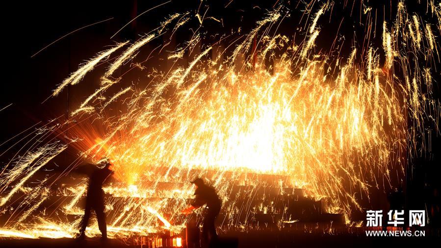 1月12日,河北磁縣開始舉行“打鐵花”慶新年活動?!按蜩F花”是以小煉鐵爐將生鐵化成鐵水后,用木板將鐵水加鋸末打上天空,鋸末在空中燃燒形成“鐵花火雨”四濺飛揚的景象。打鐵花”是當(dāng)?shù)貧v史悠久的民俗娛樂活動。新華社發(fā) (趙鴻宇 攝)