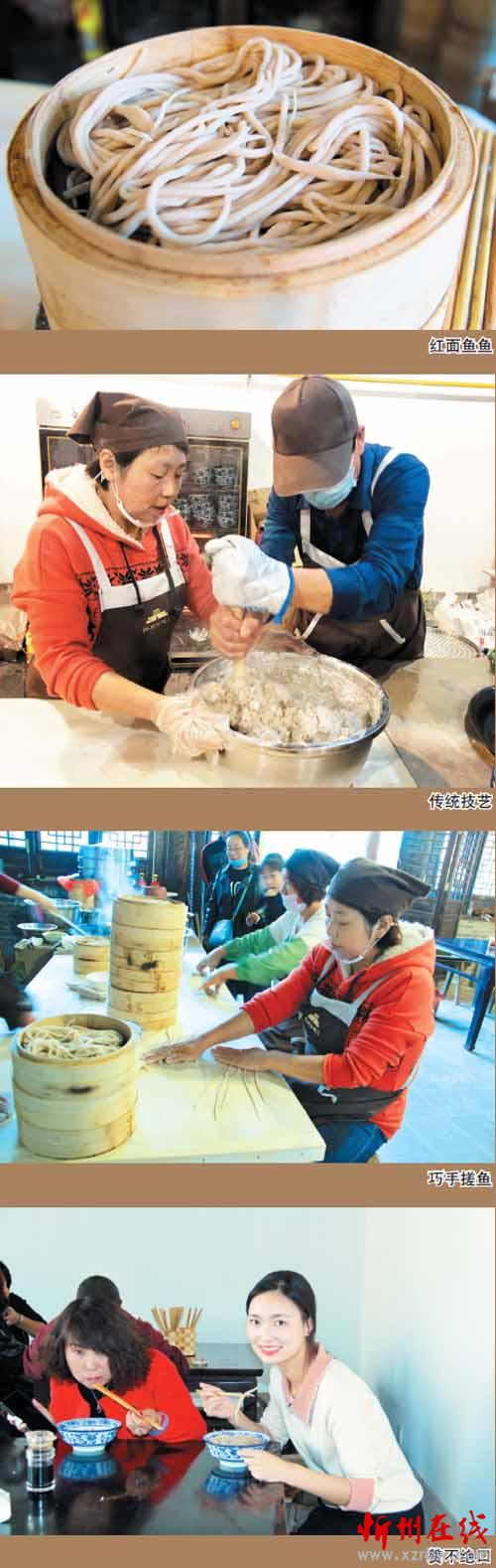 這家店的女主人叫康秀蘭,今年51歲,忻府區(qū)豆羅鎮(zhèn)韓溝村人。秀蘭從小勤快,幫助母親洗鍋?zhàn)鲲垼瑢W(xué)搓魚魚。18歲時(shí)便遠(yuǎn)近聞名,掌握了搓魚魚的好手藝。在今年忻州古城招商比賽入圍的6家店鋪中,秀蘭的小店脫穎而出,奪得第一名,拿到了開門店的資格。眼下夫妻二人經(jīng)營(yíng)著兩間大的門臉兒,小籠屜蒸魚魚,臊子有鮮肉蘑菇、西紅柿和老酸菜湯,食客們可根據(jù)自己的喜好選擇。他們兩口子既當(dāng)老板又是廚師。在食客多時(shí)臨時(shí)雇幾個(gè)幫工,小生意做得風(fēng)生水起??敌闾m告訴筆者,自開張以來食客不斷增加,國(guó)慶節(jié)假期期間一天的最高銷售紀(jì)錄是賣出200多籠紅面魚魚。