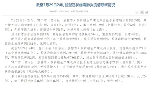 人民網(wǎng)北京7月30日電(董童)國家衛(wèi)生健康委于今日在官網(wǎng)發(fā)布的《截至7月29日24時(shí)新型冠狀病毒肺炎疫情最新情況》(以下簡稱“情況”)提出,7月29日0—24時(shí),31個(gè)?。ㄗ灾螀^(qū)、直轄市)和新疆生產(chǎn)建設(shè)兵團(tuán)報(bào)告新增確診病例105例,其中境外輸入病例3例(廣東1例,云南1例,陜西1例),本土病例102例(新疆96例,遼寧5例,北京1例);無新增死亡病例;新增疑似病例1例,為境外輸入病例(在上海)。當(dāng)日新增治愈出院病例13例,解除醫(yī)學(xué)觀察的密切接觸者584人,重癥病例較前一日增加8例。