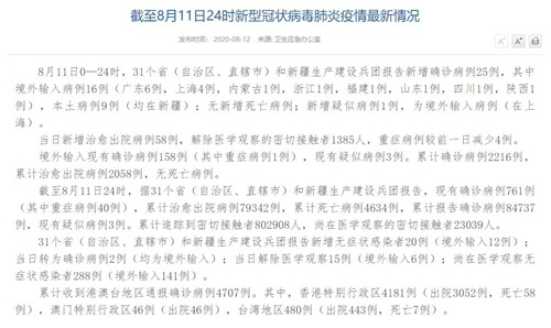 情況顯示,截至8月11日24時,據(jù)31個省(自治區(qū)、直轄市)和新疆生產(chǎn)建設(shè)兵團報告,現(xiàn)有確診病例761例(其中重癥病例40例),累計治愈出院病例79342例,累計死亡病例4634例,累計報告確診病例84737例,現(xiàn)有疑似病例3例。累計追蹤到密切接觸者802908人,尚在醫(yī)學(xué)觀察的密切接觸者23039人。