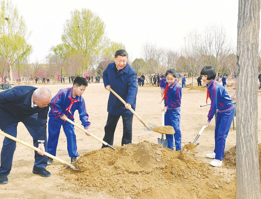 油松、國槐、側(cè)柏、玉蘭、紅瑞木、碧桃……習(xí)近平接連種下7棵樹苗。他一邊勞動,一邊向身邊的少先隊員詢問學(xué)習(xí)生活和體育鍛煉情況,叮囑他們從小養(yǎng)成愛護(hù)自然、保護(hù)環(huán)境的意識,用自己的雙手把祖國建設(shè)得更加美麗,祝他們像小樹苗一樣茁壯成長。