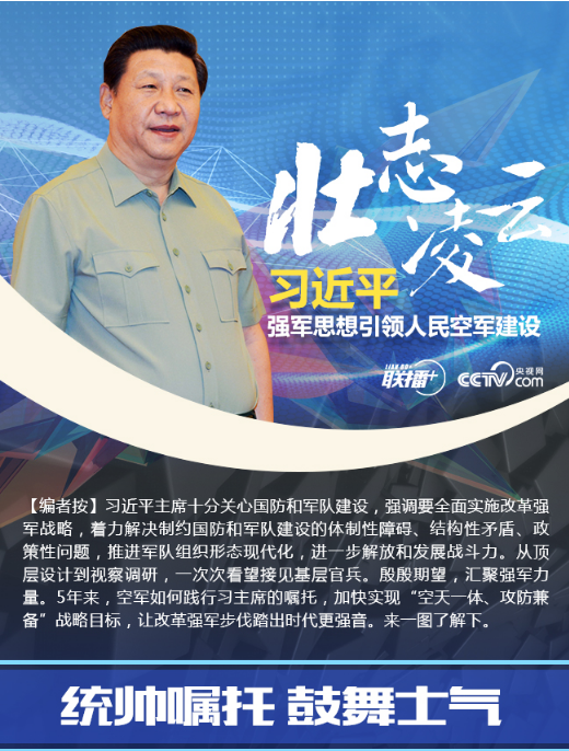 【聯(lián)播+】5年前的4月14日,中共中央總書(shū)記、國(guó)家主席、中央軍委主席習(xí)近平專(zhuān)程到空軍機(jī)關(guān)調(diào)研空軍建設(shè)和軍事斗爭(zhēng)準(zhǔn)備,代表黨中央、中央軍委向空軍全體官兵致以誠(chéng)摯的問(wèn)候,強(qiáng)調(diào)要加快建設(shè)一支空天一體、攻防兼?zhèn)涞膹?qiáng)大人民空軍,為實(shí)現(xiàn)中國(guó)夢(mèng)、強(qiáng)軍夢(mèng)提供堅(jiān)強(qiáng)力量支撐。