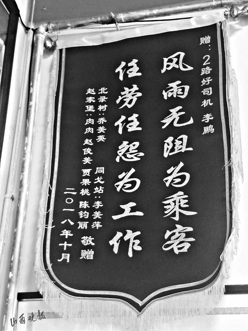 撿到東西歸還失主,失主送來表揚(yáng)信比較常見,山西晚報記者發(fā)現(xiàn)有一張比較例外。一位署名“2路乘客”的感謝信中這樣寫道:“2017年以前,可以說偶爾坐2路,因?yàn)榻?jīng)常會有等不上車的情況。但自從李鵬接上2路以后,基本上沒出現(xiàn)過等不上車的情況……作為長期乘坐公交的乘客真心非常感謝……”錦旗是7名乘客集體送的,“風(fēng)雨無阻為乘客,任勞任怨為工作”,14個字,表達(dá)的是乘客對李鵬的認(rèn)可。