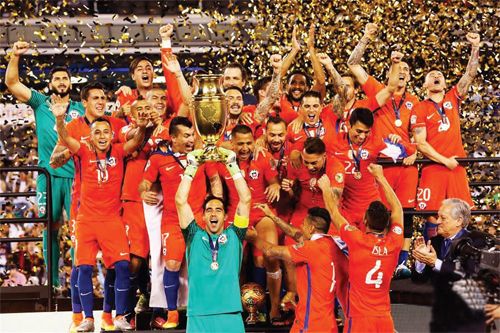 6月26日,智利隊(duì)門將布拉沃(前左一)在頒獎(jiǎng)儀式上捧杯慶祝奪冠。當(dāng)日,2016年百年美洲杯決賽在美國(guó)新澤西舉行,智利隊(duì)與阿根廷隊(duì)在120分鐘內(nèi)0比0戰(zhàn)平,智利隊(duì)在點(diǎn)球大戰(zhàn)中以4比2戰(zhàn)勝阿根廷隊(duì),奪得冠軍。 (責(zé)任編輯:武丹) |