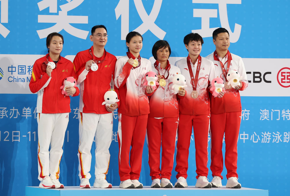 11月11日,獲得冠軍的廣東隊選手林珊(左三)、獲得亞軍的四川隊選手陳佳(左一)、獲得季軍的廣東隊選手陳藝文(右二)和她們的教練員在頒獎儀式上合影。新華社記者 楊世堯 攝